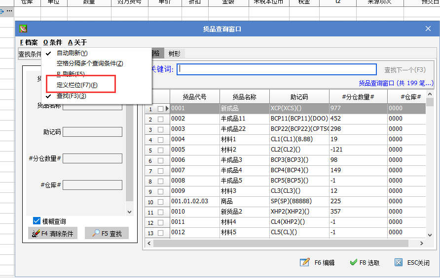 查詢窗口有兩種不同的設(shè)置方法,一種是直接查詢的窗口,例如貨品查詢,一種是速查的窗口,例如單據(jù)速查。 一、直接查詢窗口(貨品查詢) 1.貨品欄位點(diǎn)擊三個(gè)點(diǎn)進(jìn)入查詢窗口