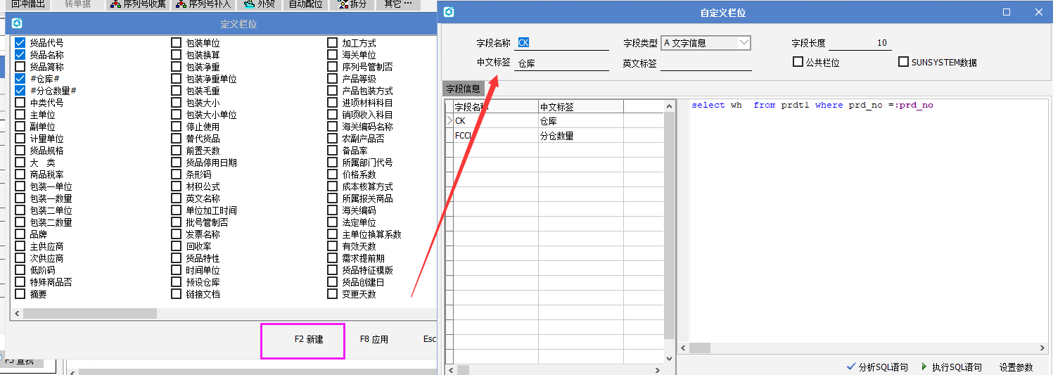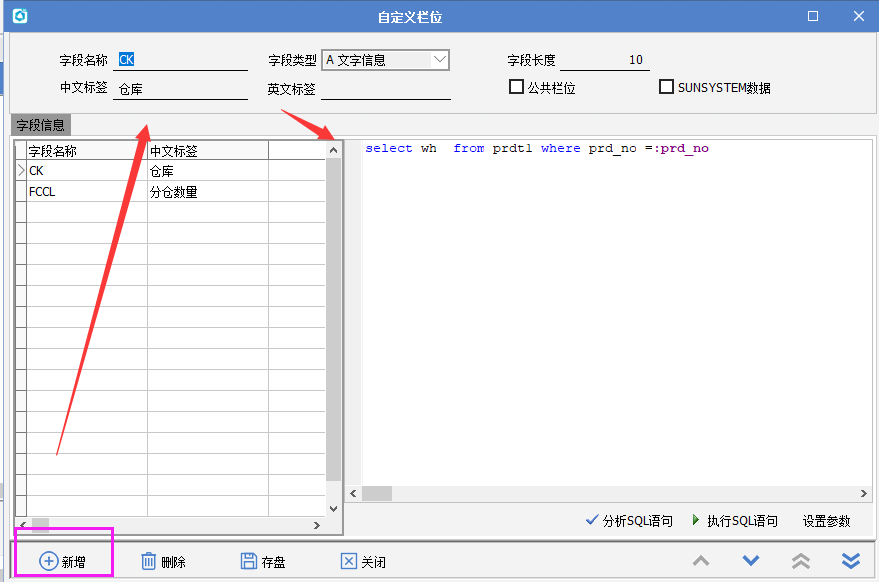 4. 新增,填寫(xiě)字段名稱,中文標(biāo)簽,字段類型,字段長(zhǎng)度等欄位,例如:新建一個(gè)倉(cāng)庫(kù)的自定義字段,字段名稱為:CK,中文標(biāo)簽:倉(cāng)庫(kù),字段類型:A文字信息,字段長(zhǎng)度:10, 語(yǔ)句格式 select欄位名稱?from表名 where 條件 select wh from prdt1 where prd_no =:prd_no