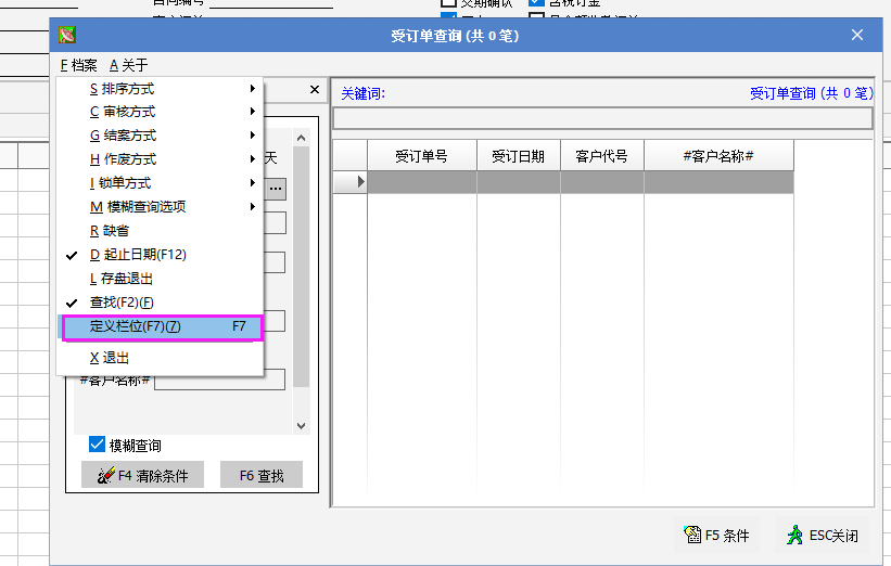 6.退出單據(jù),再重新進(jìn)入單據(jù),進(jìn)入定義欄位,才會(huì)顯示新建的自定義字段(倉(cāng)庫(kù)),再勾選上倉(cāng)庫(kù)(自定義字段,點(diǎn)擊F8應(yīng)用。