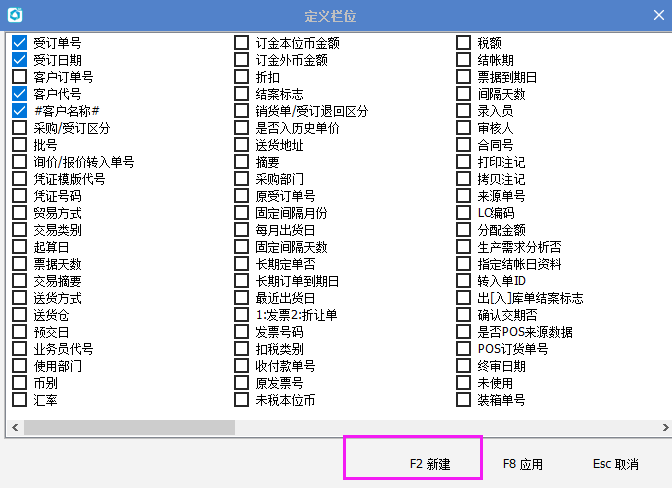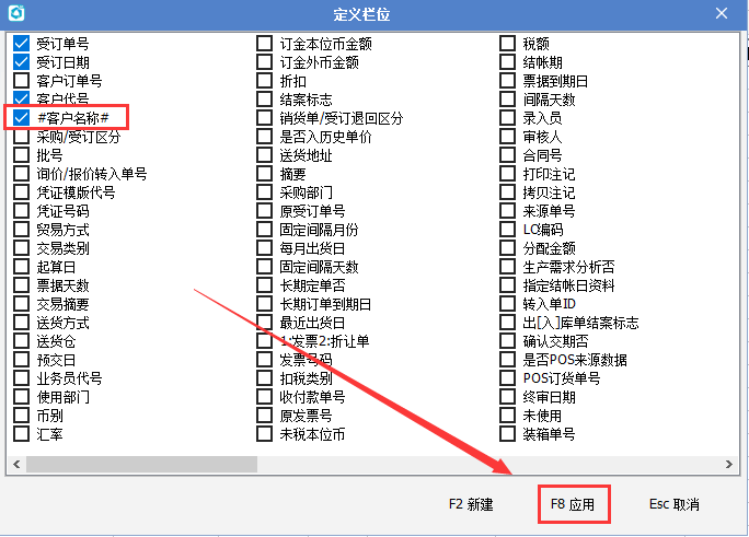 5.退出單據(jù),再重新進(jìn)入單據(jù),進(jìn)入定義欄位,才會(huì)顯示新建的自定義字段(客戶名稱),再勾選上客戶名稱(客戶名稱)自定義字段,點(diǎn)擊F8應(yīng)用。