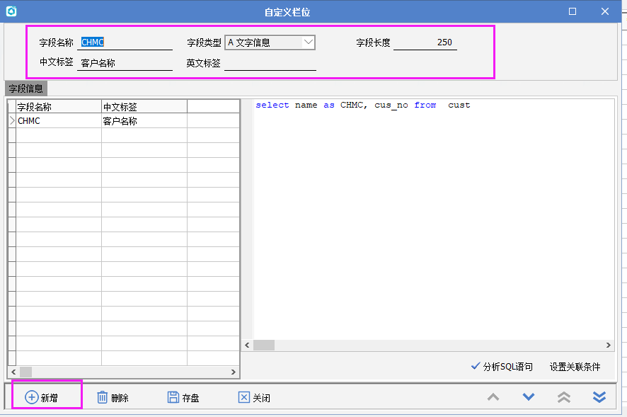 3.新增,填寫(xiě)字段名稱,中文標(biāo)簽,字段類型,字段長(zhǎng)度等欄位,例如:新建一個(gè)客戶名稱的自定義字段,字段名稱為:CHMC,中文標(biāo)簽:客戶名稱,字段類型:A文字信息,字段長(zhǎng)度:250, 語(yǔ)句格式 select欄位名稱?as?自定義字段名稱,關(guān)聯(lián)字段from表名 select name as CHMC, cus_no from cust