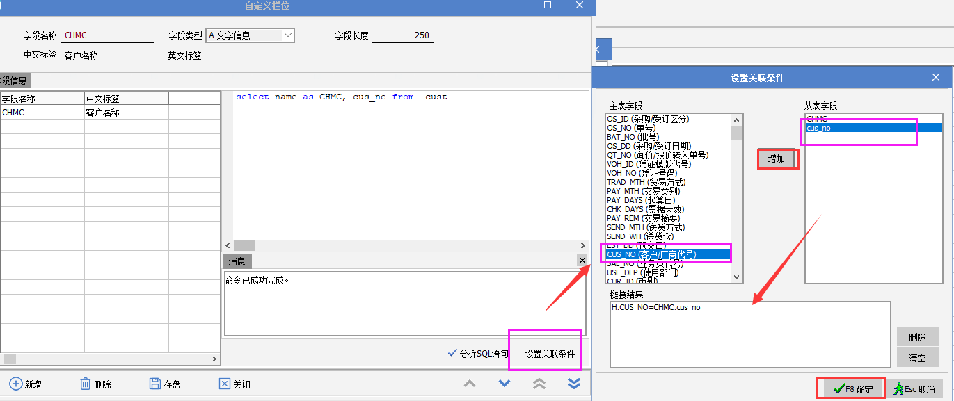 4.設(shè)置關(guān)聯(lián)條件 主表字段:受訂單客戶代號(hào)CUS_NO等于從表字段-客戶廠商資料客戶代號(hào)CUS_NO,兩張表以客戶代號(hào)關(guān)聯(lián)。