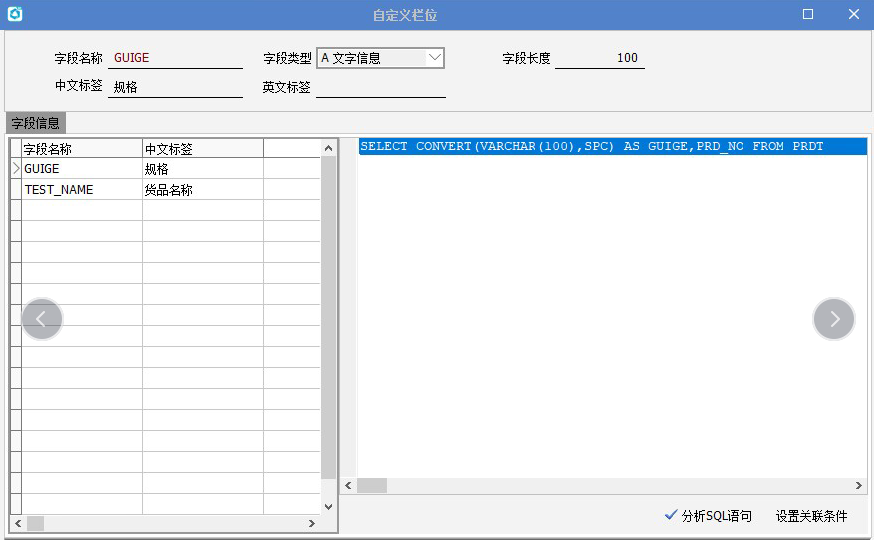 6.規(guī)格的自定義字段比較特殊,規(guī)格要用convert轉(zhuǎn)換成varchar類型的, SQL語(yǔ)句寫(xiě)法:SELECT?CONVERT(VARCHAR(100),SPC)?AS?GUIGE,PRD_NO?FROM?PRDT