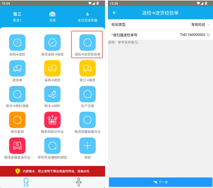 5、PDA錄入【送檢->進(jìn)貨檢驗(yàn)單】 打開(kāi)單據(jù),選擇“檢驗(yàn)類型”,掃描進(jìn)貨送檢單號(hào),點(diǎn)擊【下一步】 ◎ 檢驗(yàn)類型:支持“常規(guī)檢驗(yàn)”和“復(fù)檢”