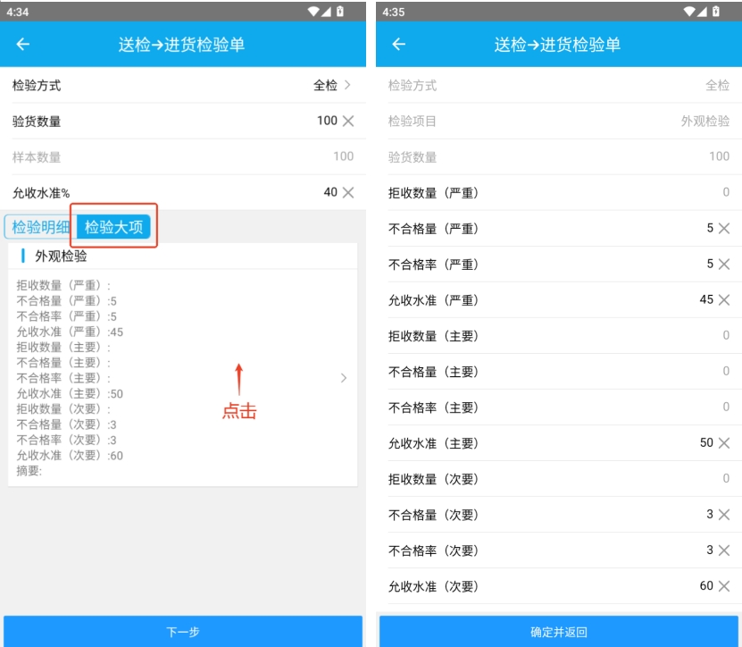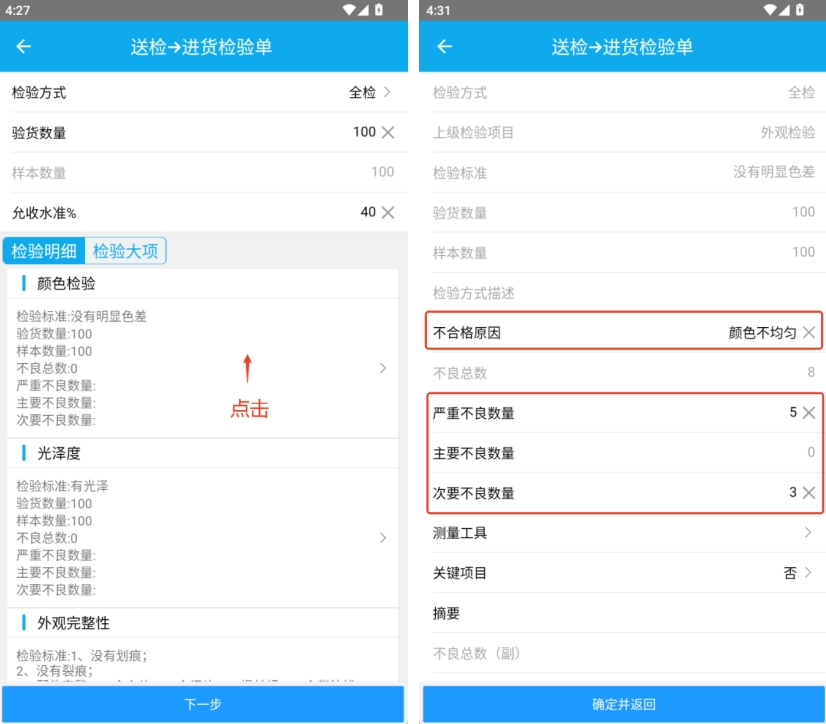 確定“檢驗(yàn)方式”(“全檢”或“抽樣”)、“驗(yàn)貨數(shù)量”、“允收水準(zhǔn)%” 點(diǎn)擊【檢驗(yàn)明細(xì)】項(xiàng)次內(nèi)容,如果有不合格的貨品,則選擇“不合格原因”,輸入“嚴(yán)重不良數(shù)量”、“主要不良數(shù)量”或“次要不良數(shù)量”,輸入完成后點(diǎn)擊【確定并返回】,