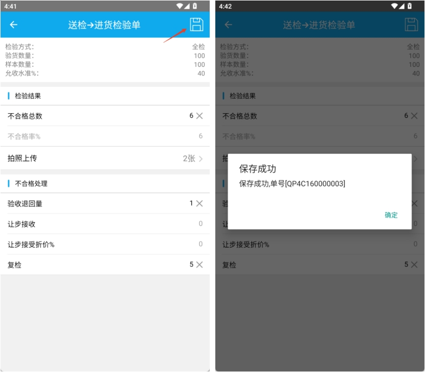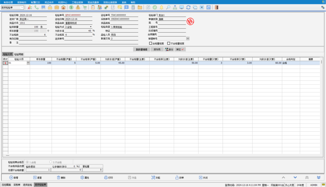 6、ERP查看【進(jìn)貨檢驗(yàn)單】 在PDA保存的單據(jù),可以在ERP【進(jìn)貨檢驗(yàn)單】中查看